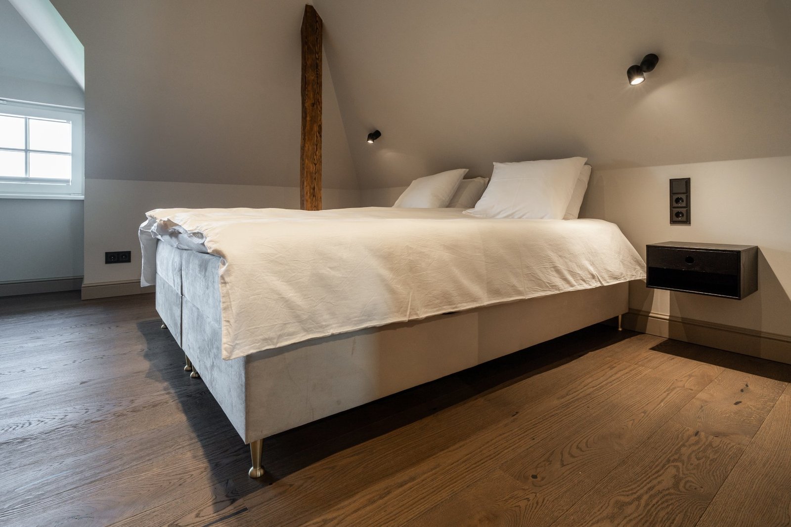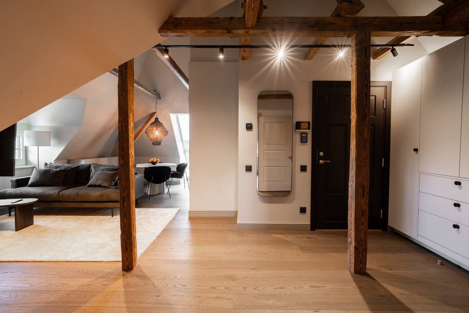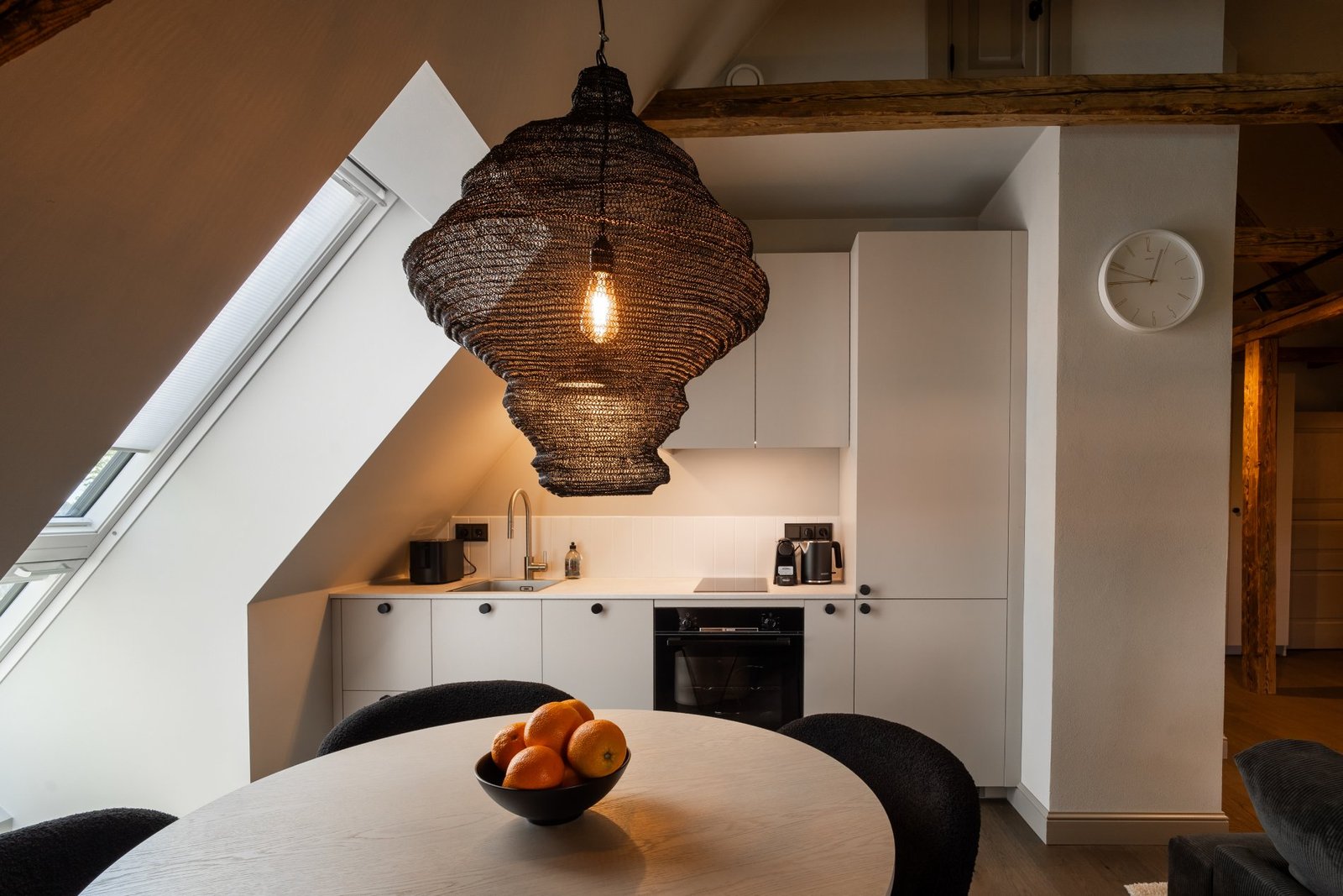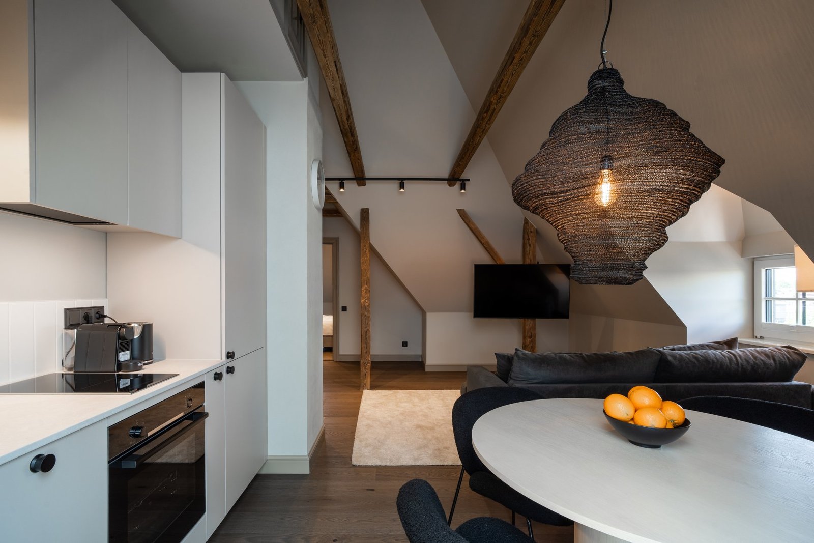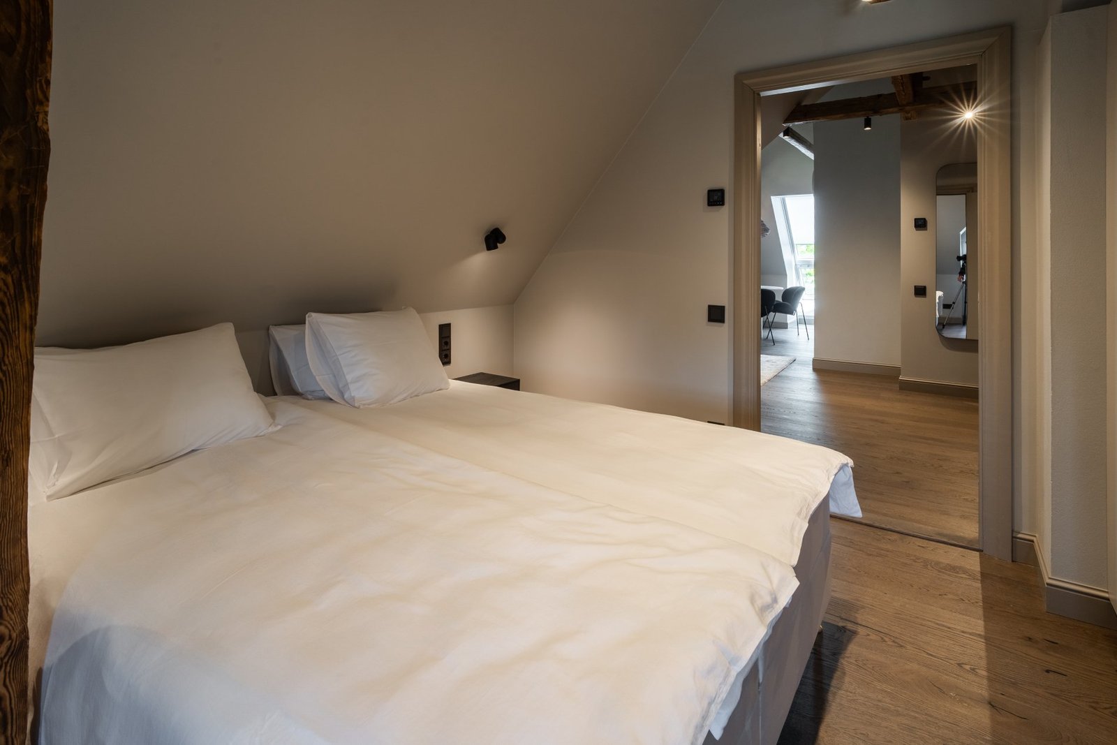 A penthouse with a spacious bedroom and a hidden secret chamber. High ceilings and an open-plan kitchen-living room give the apartment a pleasant, airy feel. All guest apartments include free parking in a fenced garden area and convenient keyless entry, allowing you to arrive at a time that suits you best.