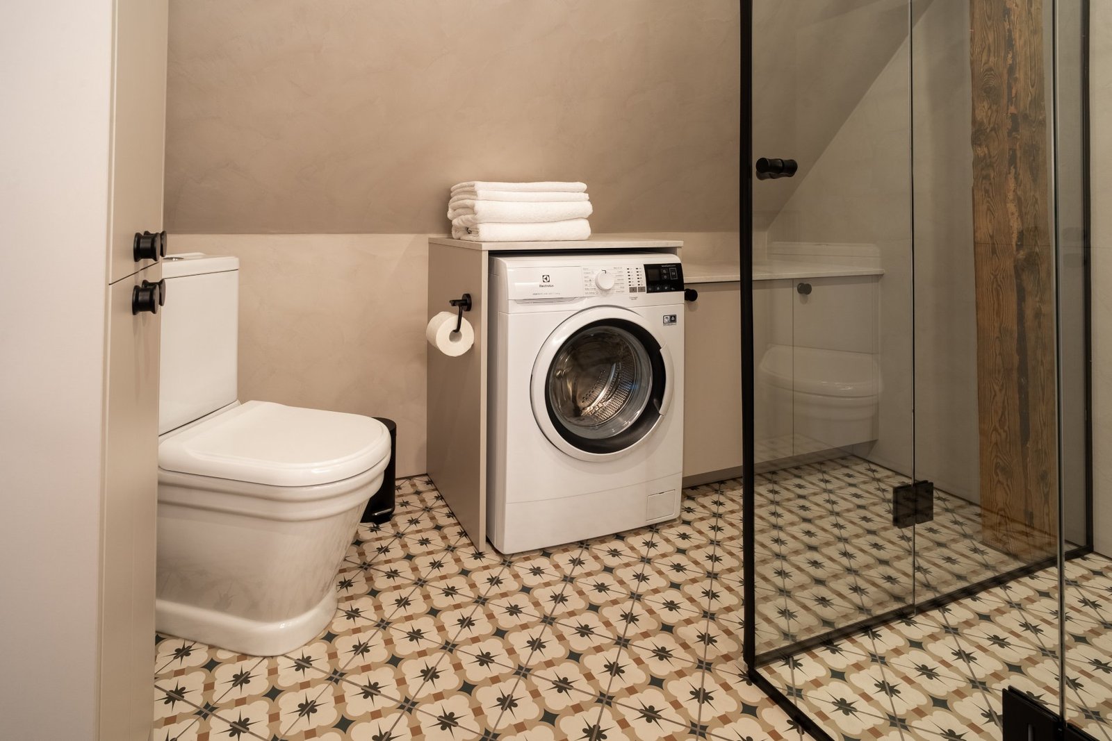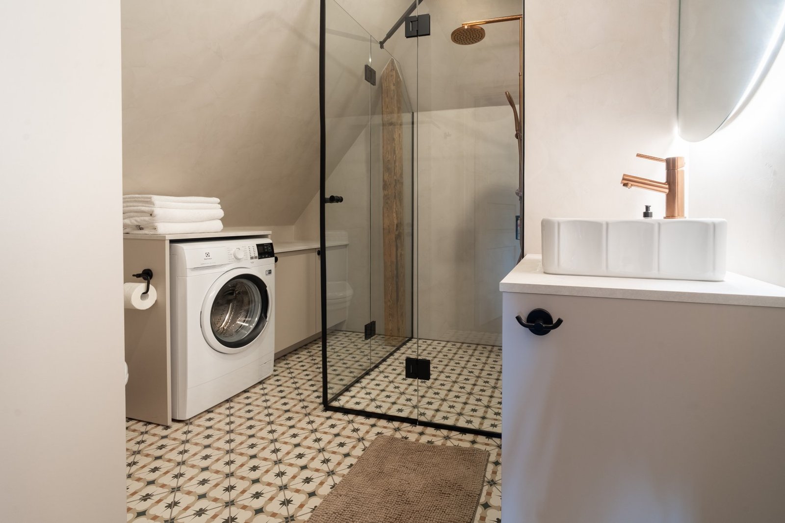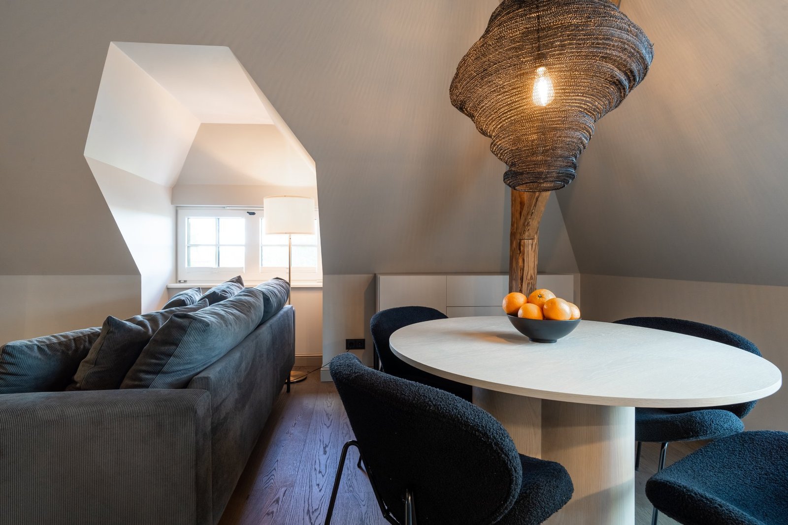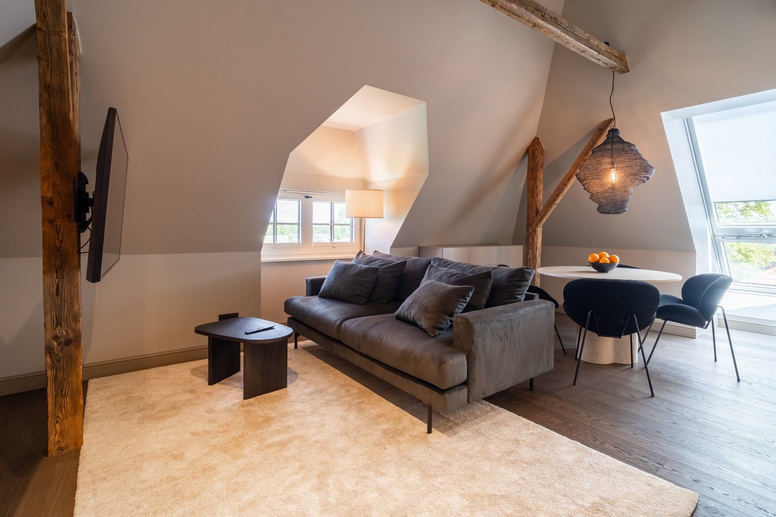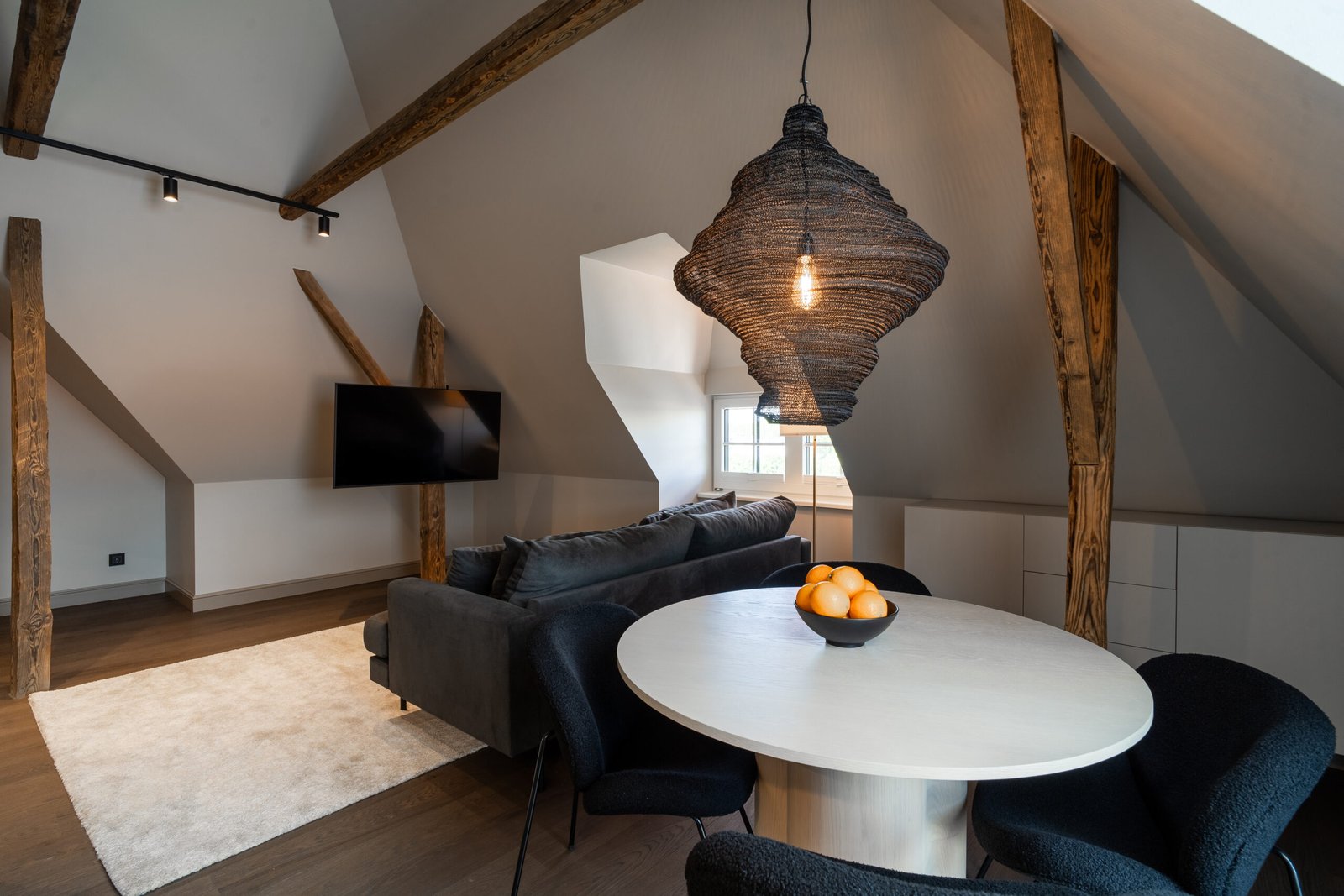 A penthouse with a spacious bedroom and a hidden secret chamber. High ceilings and an open-plan kitchen-living room give the apartment a pleasant, airy feel. All guest apartments include free parking in a fenced garden area and convenient keyless entry, allowing you to arrive at a time that suits you best.